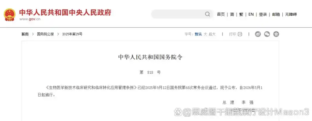 法治框架基本成型?!渡镝t(yī)學(xué)新技術(shù)臨床研究和臨床轉(zhuǎn)化應(yīng)用管理條例》正式發(fā)布,自2026年5月1日起實施。該條例明確了“研究—轉(zhuǎn)化—應(yīng)用”全流程管理要求,對干細胞等前沿技術(shù)設(shè)立了倫理審查、全過程風(fēng)險控制、信息公開與機構(gòu)資質(zhì)標(biāo)準(zhǔn),為行業(yè)提供了統(tǒng)一、可預(yù)期的制度環(huán)境。